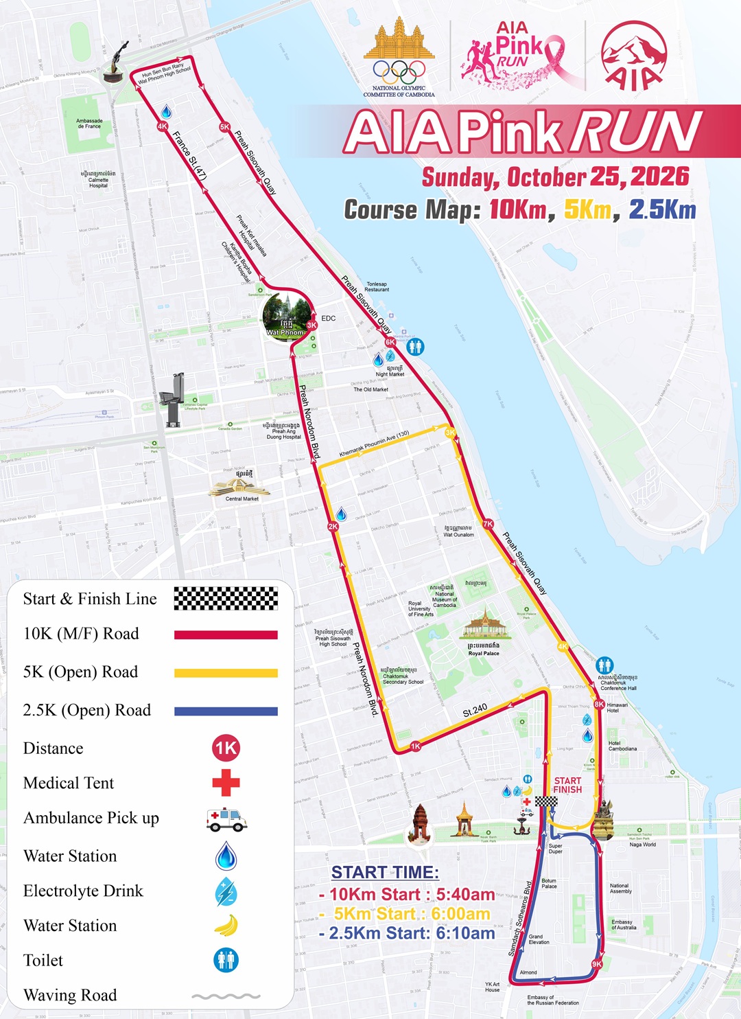 The National Olympic Committee of Cambodia in cooperation with AIA (Cambodia) Life Insurance Plc. and related corporations are organizing the 04th AIA Pink Run (10km, 5km and 2.5km family Fun Run) to as well as increase awareness of breast cancer.