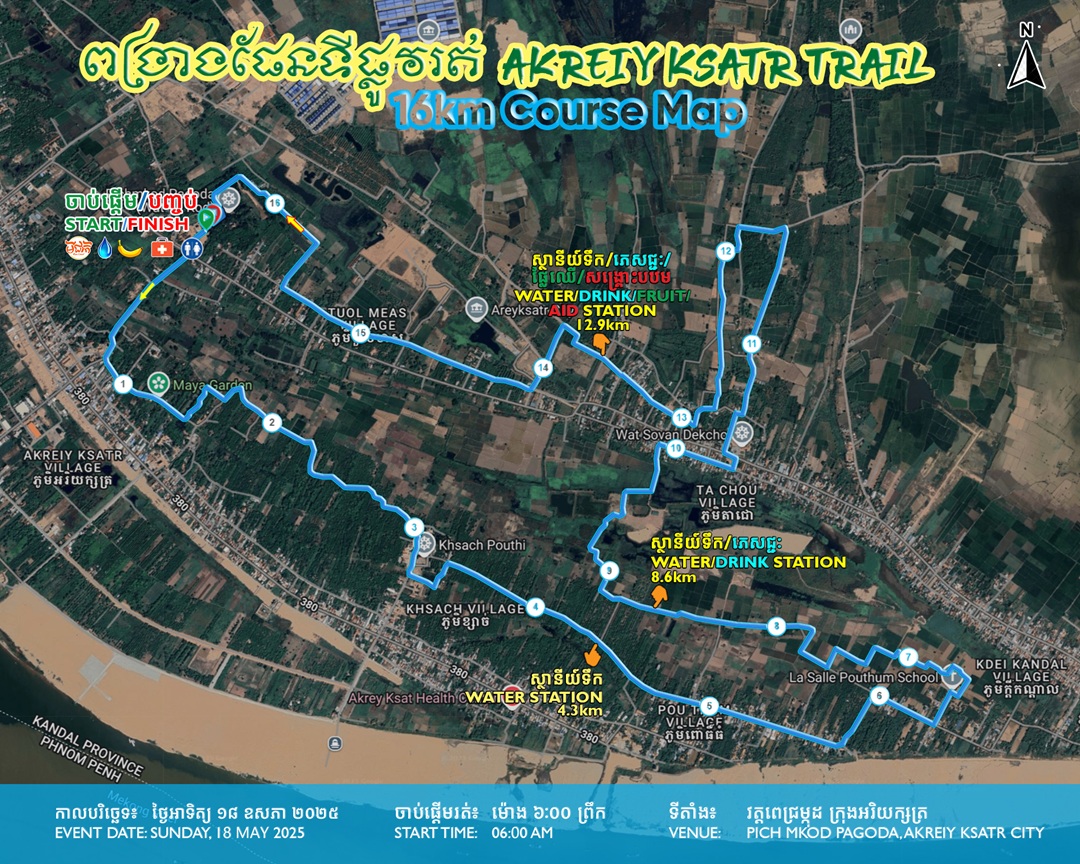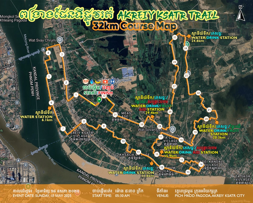 Escape the city without going far—the Akreiy Ksatr Trail brings you the only trail running experience so close to home, just east of Phnom Penh across the Mekong River. Explore the scenic routes of Akreiy Ksatr City in Kandal Province, where runners will weave through charming villages, lush paddy fields, and exotic farms growing everything from tropical fruits to fragrant herbs. Breathe in the fresh air as you pass by serene lotus ponds in full bloom, their pink petals glistening under the morning sun. Along the way, discover ancient pagodas and catch breathtaking views of the Phnom Penh skyline on the horizon. Whether you're a seasoned trail runner or looking for a refreshing outdoor challenge, this event offers a unique blend of nature, culture, and adventure—all just a stone's throw from the capital. Lace up and join the journey!
